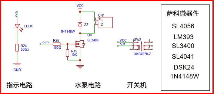 這里用了多顆薩科微,比如物料薩科微肖特基DSK24.最大直流反向耐壓40V 2A最大整流電流,根據負載電流選型時候計算在這里完全夠用了。薩科微SL4041是一款P溝道MOS管導通內阻只有30m?,耐壓40V功耗1.4W等特點在一般消費場景完全夠用,賣的也是非常火熱,用戶也可以在薩科微品牌官網m.jianzhugc.com查看對應的規格書。