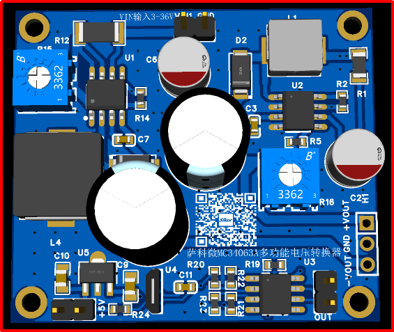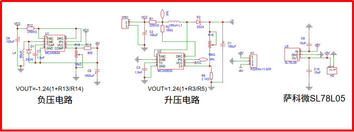 4.2圖二為薩科MC34063A微升降壓調(diào)節(jié)器。在輸入端接5V供電,調(diào)節(jié)電位器R15和R16能得到正負電壓,比如+-9V,+-12V來給運放放大器LM2904提供正負電壓源供電。MC34063A很方便就能實現(xiàn)一個負壓調(diào)節(jié)器。同時MC34063A是一款單片開關(guān)穩(wěn)壓器控制電路,包含直流-直流轉(zhuǎn)換器所需的主要功能。該器件由內(nèi)部溫度補償基準源、電壓比較器、帶有源電流限制電路的可控占空比振蕩器、驅(qū)動器和大電流輸出開關(guān)組成。