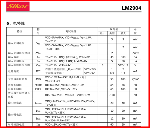 強度的關(guān)系曲線圖。從圖中可以看到磁場強度和輸出電壓呈線性關(guān)系。非常適合薩科微LM2904這類運放去采集它的一個輸出信號。LM2904輸入失調(diào)電壓3-5Mv,電源電壓范圍寬:單電源(3V~20V);雙電源 (±1.5V~±10V)用雙電源供電方式能更精準的進行信號采集。參數(shù)如下圖