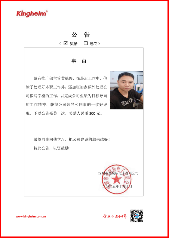 2025年10月08日到2025年10月11日,金航標(biāo)(www.kinghelm.net)/薩科微(www.slkoric.com)“每周之星”經(jīng)過(guò)同事們?cè)u(píng)比,這周“每周之星” 是推廣部主管黃德俊,在最近工作中,他除了處理好本職工作外,還加班加點(diǎn)額外處理公司搬寫(xiě)字樓的工作,以完成公司業(yè)績(jī)?yōu)槟繕?biāo)導(dǎo)向的工作精神,獲得公司領(lǐng)導(dǎo)和同事的一致好評(píng),現(xiàn)予以公告嘉獎(jiǎng)一次,獎(jiǎng)勵(lì)人民幣 300元。