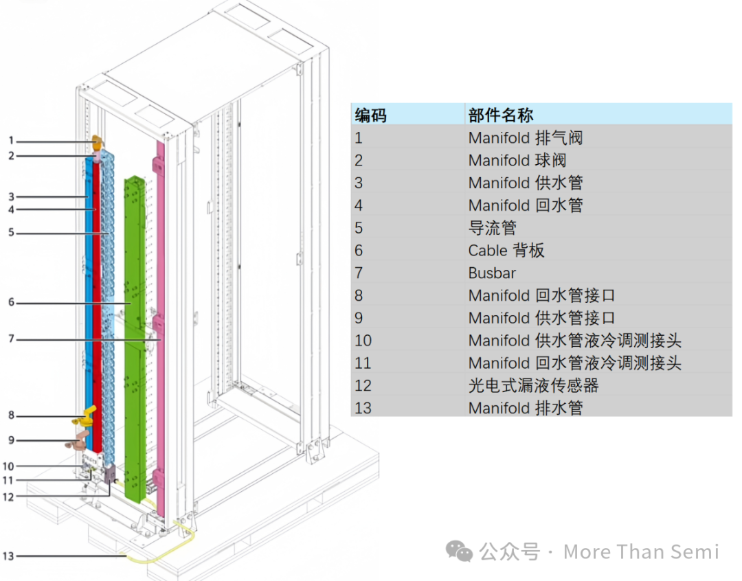 對于服務(wù)器機(jī)架中液冷的拆解,查了很久沒有查到NVL72的很好的圖,下面這個圖是參考的ZOMI大神的一個圖,這個是華為的服務(wù)器的拆解,但機(jī)架其實(shí)差不太多,也可以供大家參考,了解在Rack層面,哪些是跟液冷相關(guān)的。