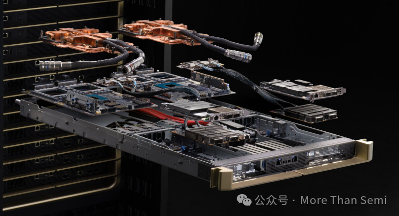 每個compute tray是包含4個GB200,也就是兩個Bianca 板卡,每塊 Bianca 板卡配備 1 顆 Grace CPU 和 2 塊 Blackwell GPU。下圖中cold plate也就是冷板覆蓋的就是一個 Bianca 板卡。所以在GB200中,1個CPU及2個GPU對應(yīng)一個大冷板。而GB300中,則是每個芯片對應(yīng)一個小冷板。