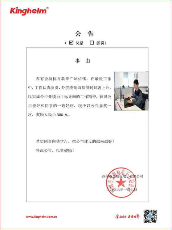 2026年01月05日到2026年01月09日,金航標(www.kinghelm.net)/薩科微(www.slkoric.com)“每周之星”經過同事們評比,這周“每周之星”是金航標谷歌推廣邱信鈺,