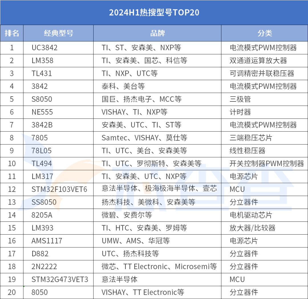 2024年1-6月芯查查搜索排名已經出爐,搜索排名前20的物料大部分為電源芯片,表明該類芯片應用廣、可選擇型號多,成本敏感應用更偏向于考慮使用技術成熟的型號。