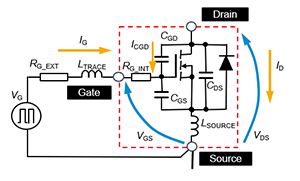 LS(低側)側SiC MOSFET在Turn-on和Turn-off時的VDS和ID變化方式不同。在討論SiC MOSFET的這種變化對Gate-Source電壓(VGS)的影響時,需要考慮包括SiC MOSFET的柵極驅動電路在內的等效電路。